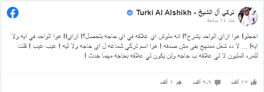 كتب تركي آل الشيخ رئيس هيئة الترفيه في المملكة العربية السعودية والرئيس الشرفي السابق للأهلي، رسالة عبر حسابه على فيسبوك.