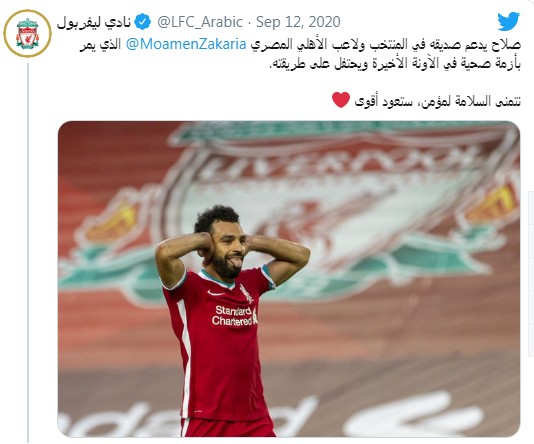 وجهت الصفحة الرسمية للنادي الأهلي رسالة شكر للفرعون المصري محمد صلاح المحترف في صفوف نادي ليفربول الإنجليزي، بعد دعمه للاعب القلعة الحمراء مؤمن زكريا في أزمته الصحية وتقليد حركته الشهيرة بعد تسجيله للهدف الثالث للريدز في مباراته أمس .