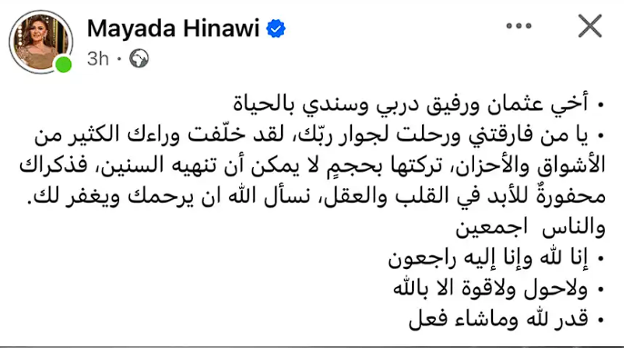 ميادة الحناوي تنعى شقيقها عثمان بكلمات مؤثرة: “رحلت وتركت في قلبي فراغاً لا يملؤه أحد”