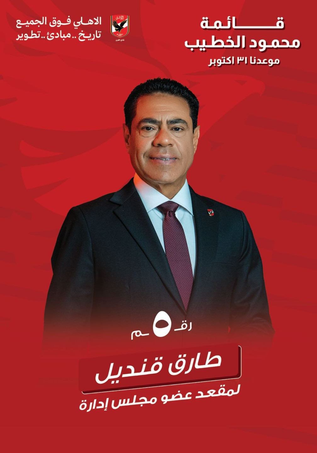 أعلن طارق قنديل، عضو مجلس إدارة النادي الأهلي ومدير عام اول بالمصرف العربي الدولي (AIB)، عن خوضه سباق انتخابات النادي الأهلي المقبلة، والمقرر عقدها في 31 أكتوبر 2025، ضمن قائمة الكابتن محمود الخطيب، تحت شعار «تكملة المشوار.. تنمية واستثمار».