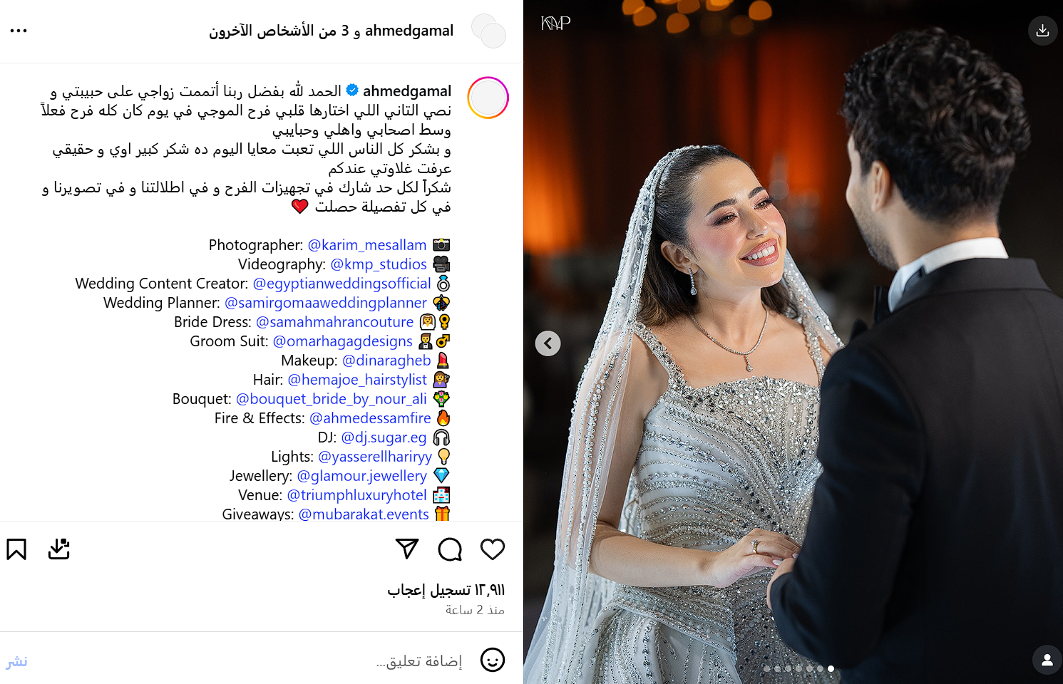 التعليق الأول من أحمد جمال بعد زفافه على فرح الموجي