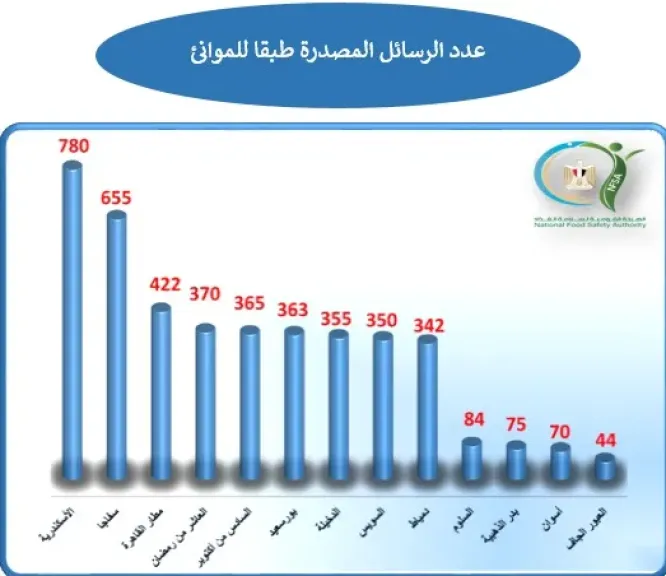 وجاء ميناء الإسكندرية في مقدمة المنافذ المستقبلة بعدد 605 رسائل، يليه مطار القاهرة الدولي بـ 341 رسالة، ثم ميناء السخنة بـ 270 رسالة.
