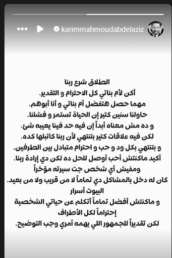 اختار كريم أن يُعلن الخبر بنفسه عبر حسابه الرسمي على موقع “إنستجرام”، حيث نشر بيانًا قال فيه:“الطلاق شرع ربنا، وأكنّ لأم بناتي كل الاحترام والتقدير، ومهما حصل ستظل أم بناتي وأنا أبوهم. حاولنا سنين كتير إن الحياة تستمر وفشلنا”.