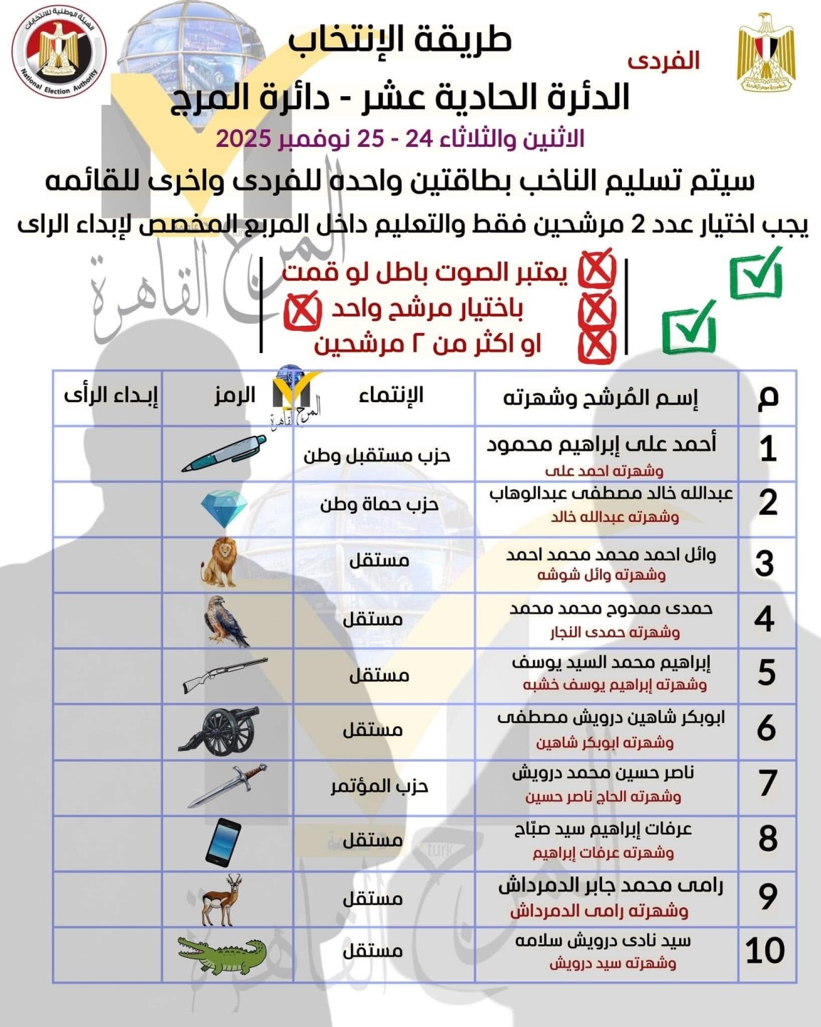 قبل ساعات من انطلاق المرحلة الثانية من انتخابات مجلس النواب 2025، ترتفع وتيرة المنافسة داخل دائرة المرج بمحافظة القاهرة، حيث يستعد 10 مرشحين لخوض سباق محتدم على مقعدين فقط، في واحدة من أكثر الدوائر سخونة بالعاصمة.